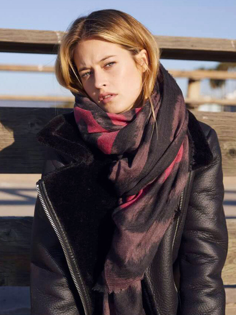Our new wool–silk blend scarf features a bold, magnified Tiger design in shades of black and purple-brown, finished with our bright pink signature unconditional statement for a true D/Luca touch. Crafted from a luxurious silk–wool blend, it offers an ultra-lightweight, incredibly soft, and smooth texture that feels like a gentle embrace. Timeless and versatile, this scarf is the perfect year-round accessory, elevating both day and evening outfits with ease.