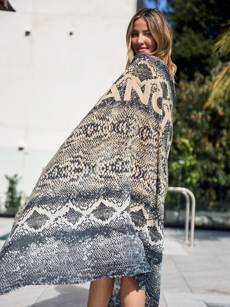 Our fine Silk Cotton weave with eyelash fringe is versatile for year-round wear. Soft and lightweight, it complements any outfit effortlessly, making it the perfect day-to-night accessory. Our Snakeskin design features ombre shades of sand and grey, with our signature "Sanctuary" subtly shadowed across it, making this a distinctive D/Luca Scarf. Each scarf includes a D/Luca branded pouch to protect its beauty.